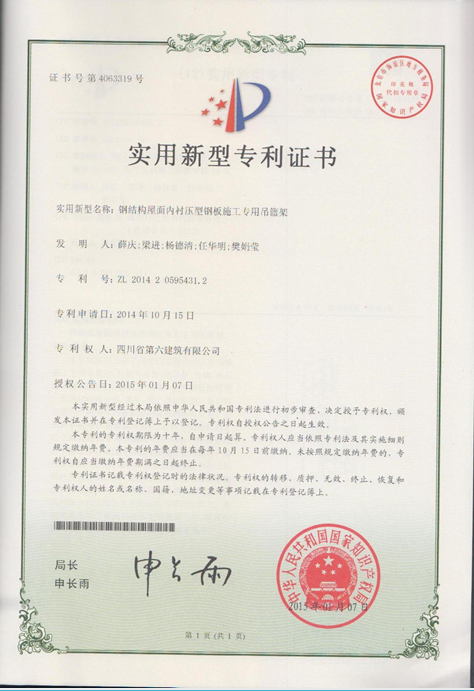 由一分公司好圣2#鑄造車(chē)間項(xiàng)目部申請(qǐng)的“鋼結(jié)構(gòu)屋面內(nèi)襯壓型鋼板施工專用吊籃架”榮獲國(guó)家實(shí)用新型專利,該專利于2015年1月7日起生效。